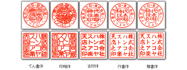 当店の法人印(法人実印・法人銀行印・角印)は、行書体、印相体、古印体、てん書体の4書体からお選び頂けます。会社名が解りやすいてん書体を選択される方が多いです。