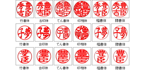 個人印(実印・銀行印・認め印)の書体は行書体、印相体、古印体、てん書体、隷書体、楷書体の6書体からお選び頂けます。
