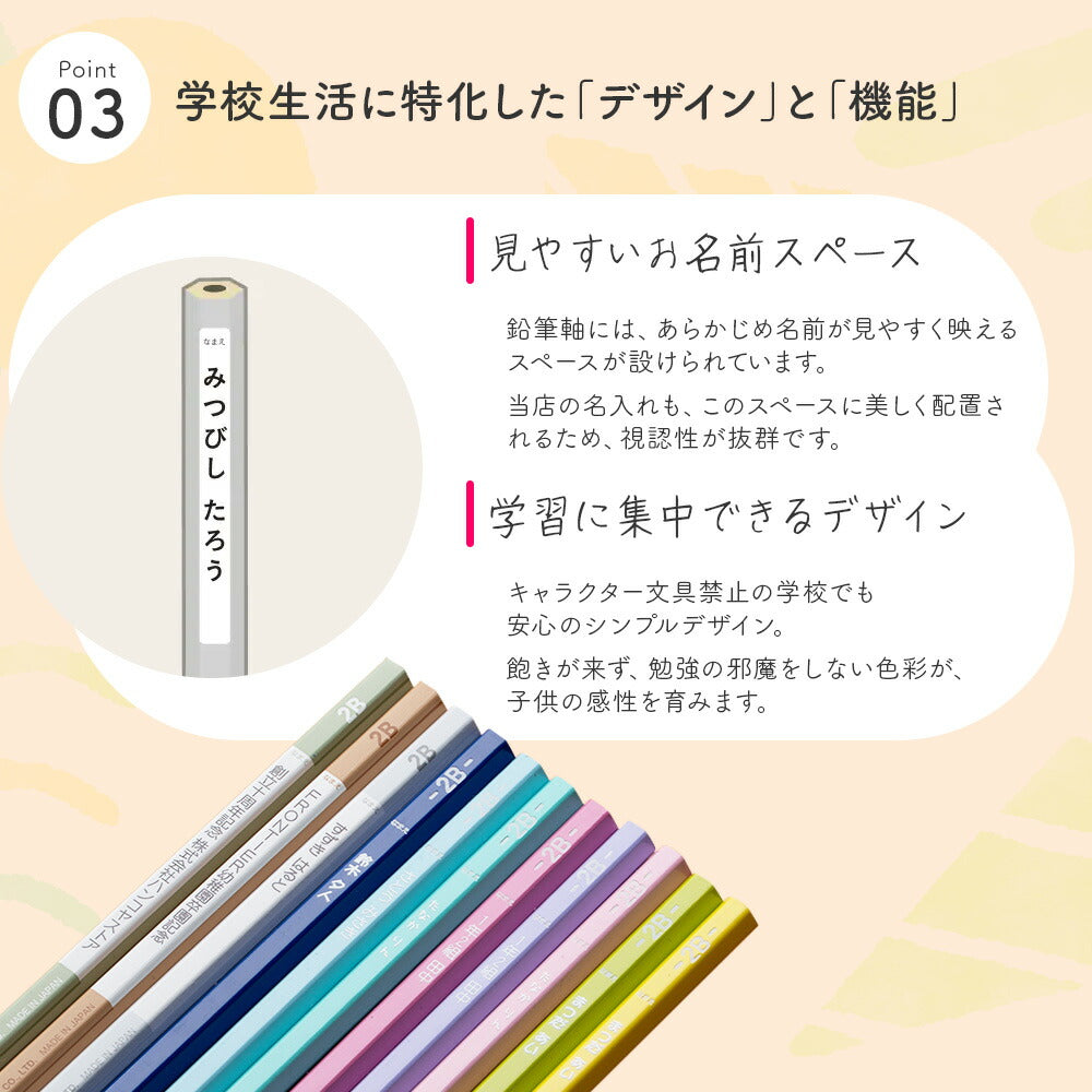 130年以上の歴史を持つ三菱鉛筆の技術で丁寧に作られた日本製。芯が折れにくく、なめらかな書き心地で、漢字練習も計算ドリルもスラスラ書けます。デザインだけでなく、使いやすさにもこだわった高品質な学習用鉛筆です。